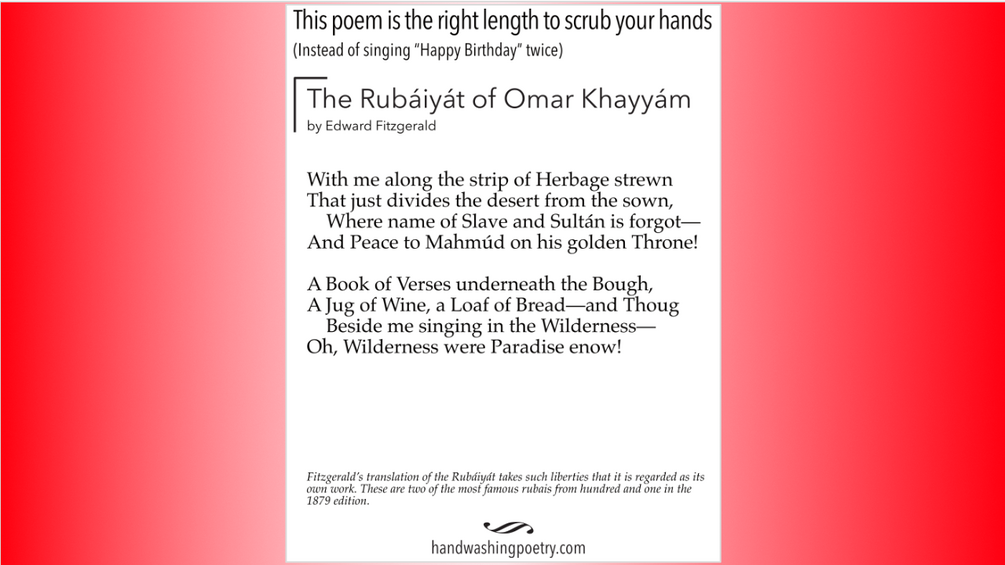 Twenty beautifully typeset poems, all the right length to time scrubbing your hands by reading them. The collection includes works by